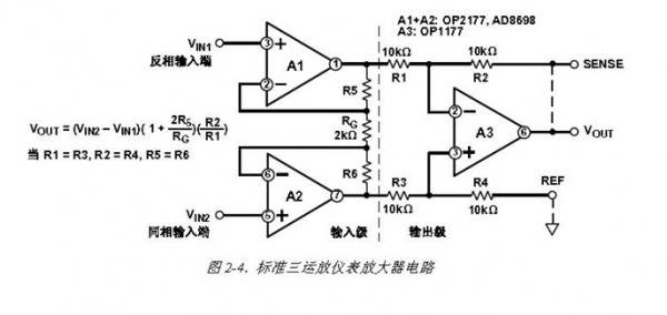 专用的仪表放大器价格通常比较贵,于是我们就想能否用普通的运放组成仪表放大器?答案是肯定的。使用三个普通运放就可以组成一个仪用放大器。电路如下图所示: