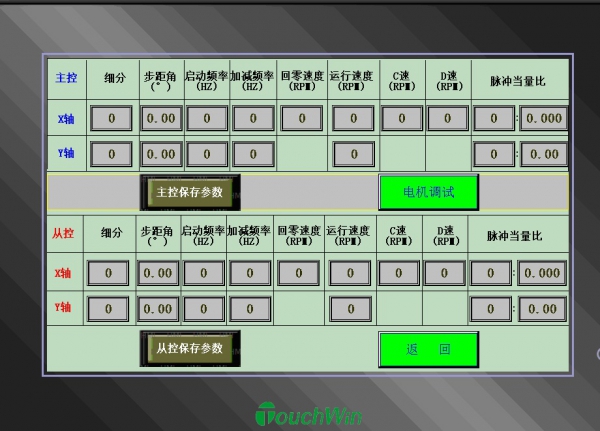 X轴运行4个位置(1-2-3-4)距离设定;Y轴翻转角度设定;X轴运行速度和回零速度设定;各电机轴基本参数设定。