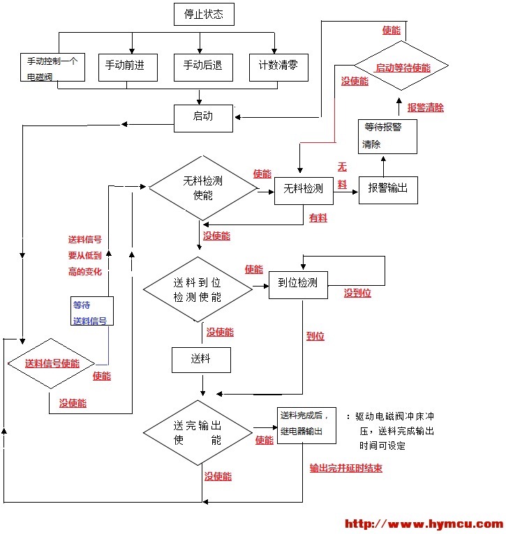 6) 其余功能:具有无料检测、送完输出检测、系统急停/暂停/启动、产品数量计数清零、产量计数到达或无料停机时有报警输出功能;无料检测、送料到位使能两个功能,每个功能如设置为0,即跳过该功能进行下一步工序,两个功能都短接,即冲床主动触发信号控制送料;如启用,即送料到位后控制冲床动作。