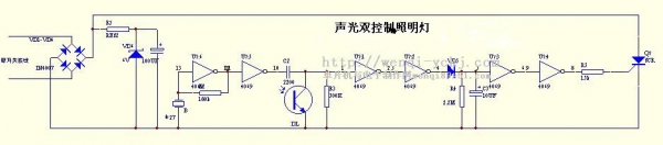 电路中,反相器D1作为电压放大器,R2是定的偏置电阻。由压电陶瓷片B接收到脚步声信号,并将其转换为电脉冲后经D1放大。D2整形后由⑩脚出,光敏二极管DL和D3。D4组成光控电路,夜间由于光敏二极管的内阻很大,它和R3的并联值仍然很大,C2作为耦合电容,将D2输出的信号脉冲耦合至D3,D4,经VD5整流向C3充电;当C3充电到D5的转换电平后,D5输出低电平。再经D6反相经R5触发V3接通电灯的电源通路,该通路为:电源相线、VD2、VS、VD4、灯、电源中性线。