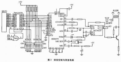 用户可事先选定脱机状态,手动开关K1和K2录入各段在报警时需要播放的固定语音段。报警器值班时语音芯片应处于联机状态。报警时程序能根据正在报警的传感器的编号(0~7)自动判断8种警性并按警情编号去选择应该播放的哪一段。图3中MIC为驻极体微音器。喇叭可监听到从电话网上收发的双音多频信号或语音信号。用MC34119作语音功放芯片,可调整放音输出的幅度。
