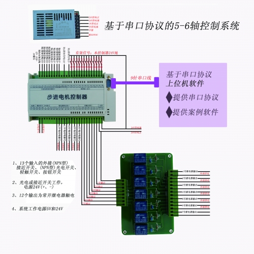 提供给客户,按照我们提供的串口协议,自行编写上位机软件(我方提供上位机的案例软件和代码:VB和VC版本,有相应的案例功能),完成对步进电机的控制、获取外部输入信号,同时输出控制继电器(外接电磁阀、气缸、油缸、报警灯等)。